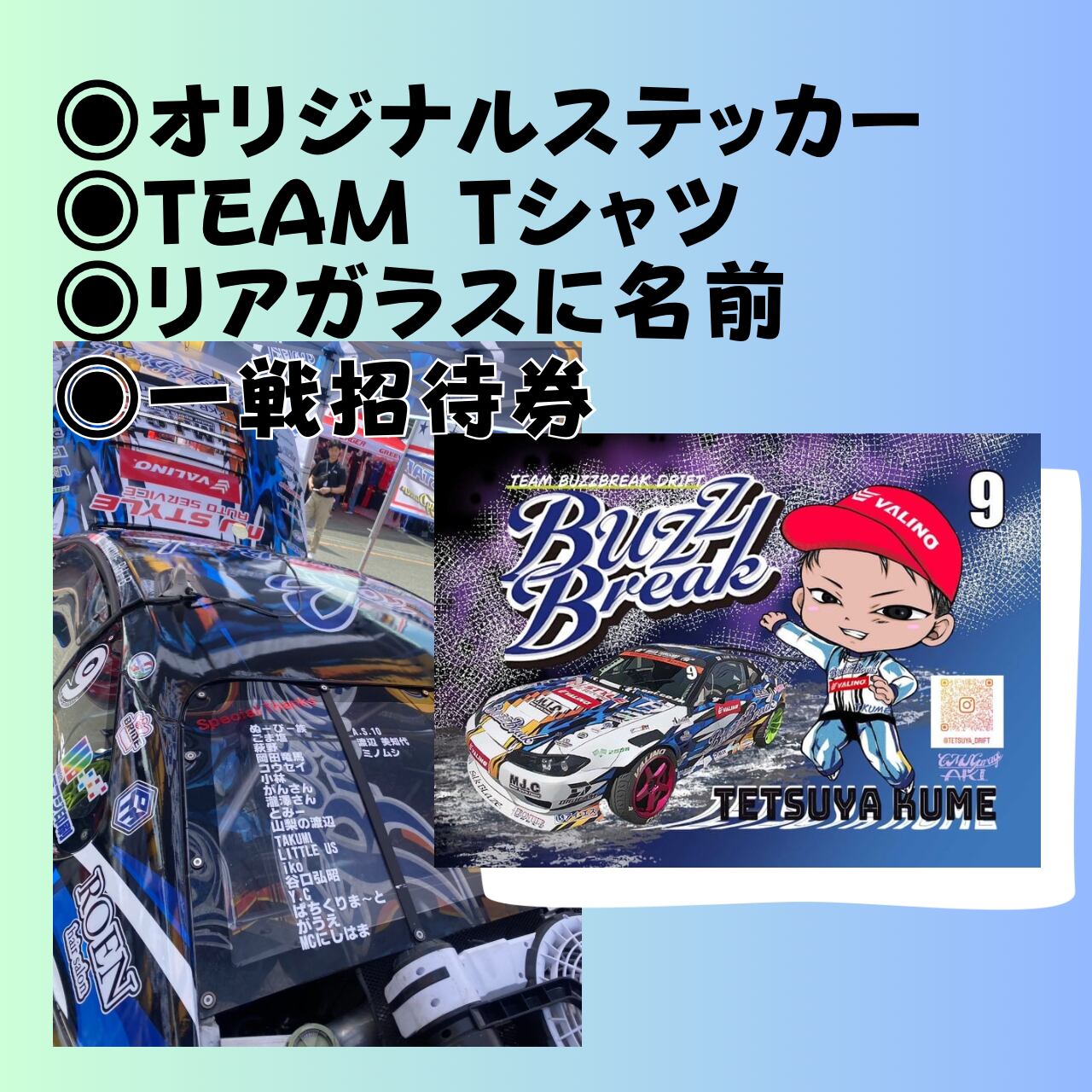 返礼品としてオリジナルステッカーと完全受注生産のチームTシャツ、一戦招待券を贈呈。